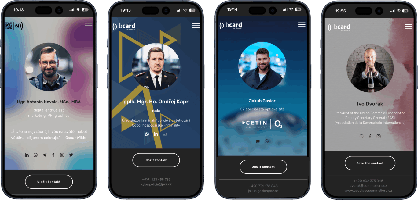 V dnešní době již na trhu naleznete několik společností, které NFC vizitky nabízí. Proč tedy zvolit bcard? Naše vizitky jsou plně přizpůsobené vaším potřebám, zpracované dle grafického manuálu vaší firmy. Pro každého klienta tvoříme unikátní design. Nepoužíváme šablony, nevkládáme do vizitek naší reklamu. Především ale za naše řešení zaplatíte jen jednou - už žádné měsíční platby!